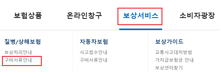 MG손해보험 홈페이지 -> 상단 카테고리 (보상서비스) -> 질병/상해보험 -> 구비서류안내