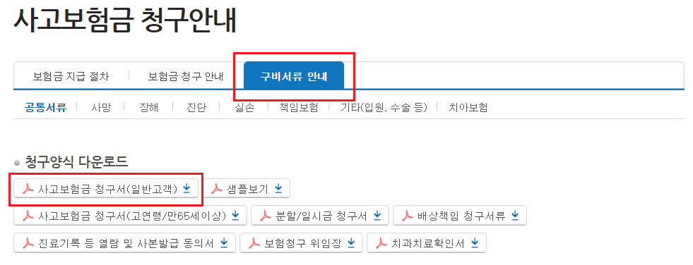 NH농협생명 홈페이지 -> 고객센터 -> 보험 가이드 -> 사고보험금 청구안내 -> 구비서류안내 -> 파일 다운로드