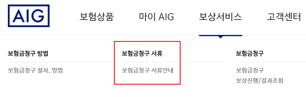 ㄴ AIG 손해보험 홈페이지 → 상단 카테고리 (보상서비스) -> 보험청구서류 (보험금청구 서류안내)