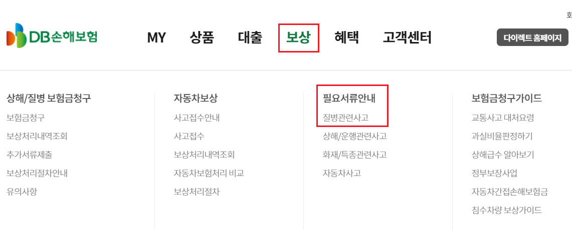 ㄴ DB손해보험 홈페이지 접속 -> 상단 카테고리 (보상) -> 필요서류안내 -> 질병관련사고
