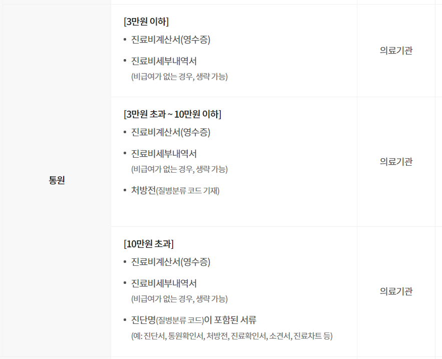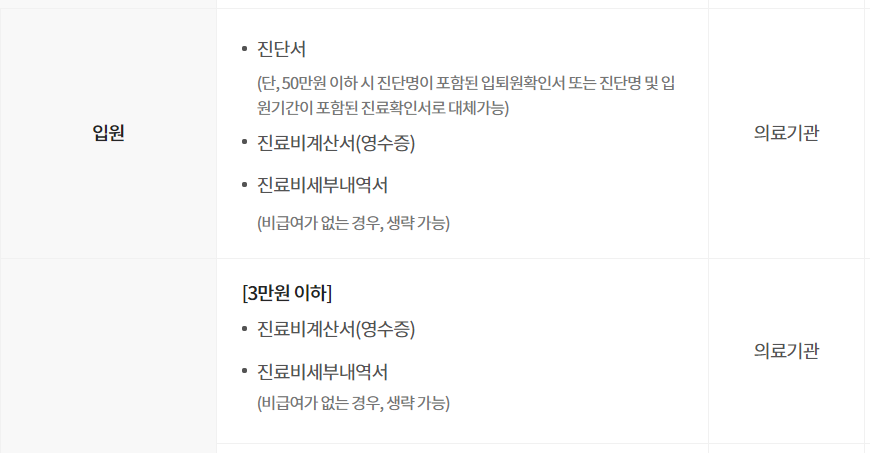 1. 진단서 (단, 50만원 이하 시 진단명이 포함된 입퇴원확인서 또는 진단명 및 입원기간이 포함된 진료확인서로 대체가능)