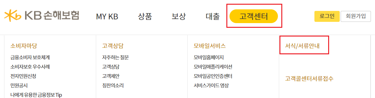 KB손해보험 사이트 -> 상단 카테고리 (고객센터) -> 서식/서류안내 -> 보험금청구