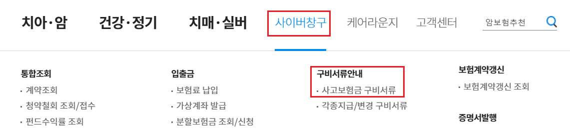 ㄴ 라이나생명 홈페이지 접속 -> 사이버청구 -> 구비서류안내 (사고보험금 구비서류)