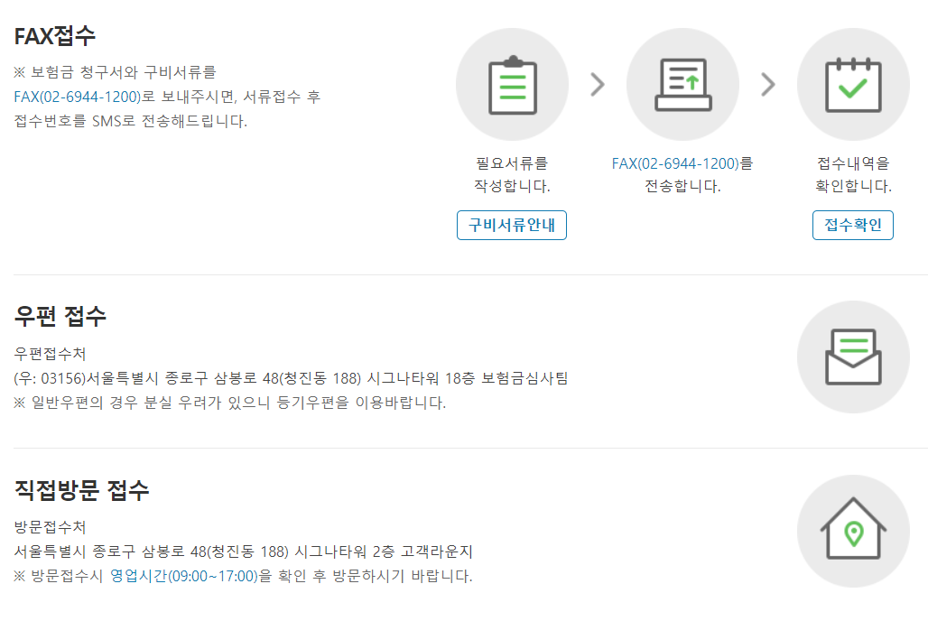 3. FAX 접수: 보험금 청구서와 구비서류를 FAX (02-6944-1200) 로 보내면 서류접수 후 접수번호를 SMS로 전송해준다고 합니다.