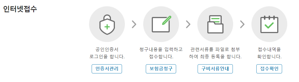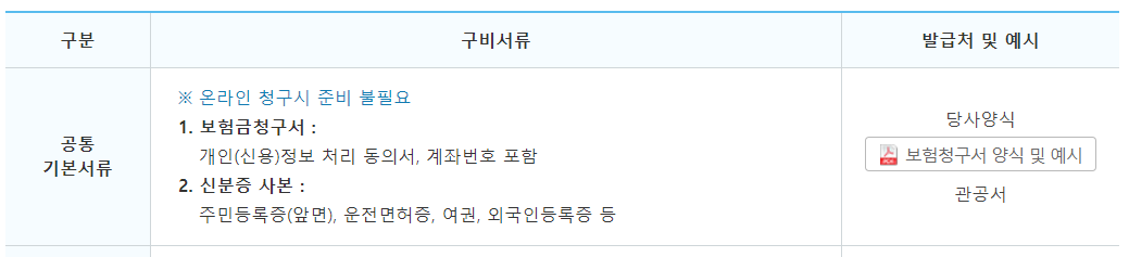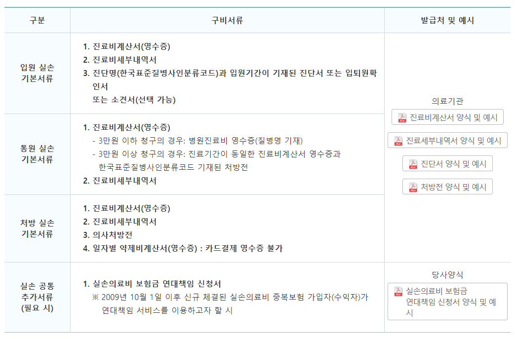 - 3만원 이상 청구의 경우: 진료기간이 동일한 진료비계산서 영수증과 한국표준질병사인분류코드 기재된 처방전